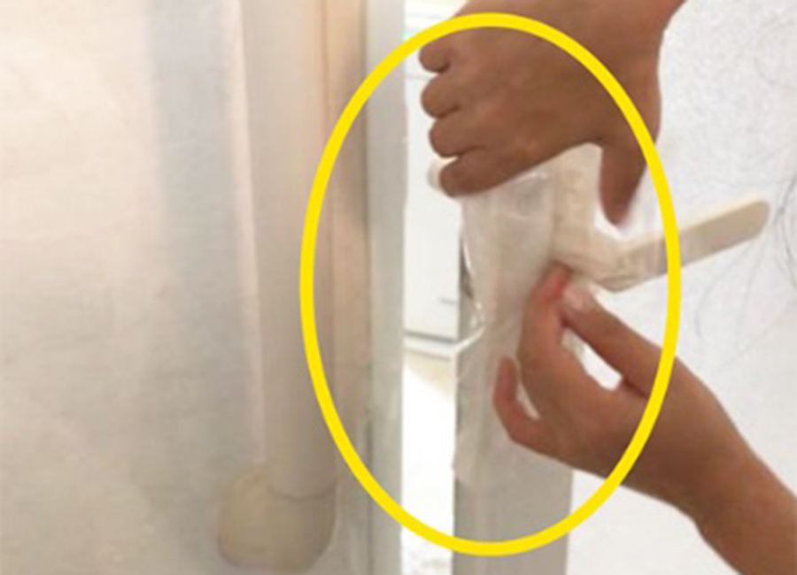 この際、ドアの内側の通風口を開けておかないとホコリが後ろに流れ出ないので注意してください。 - 浴室のドアを締めて、さらにシャワーでホコリを流し出します。