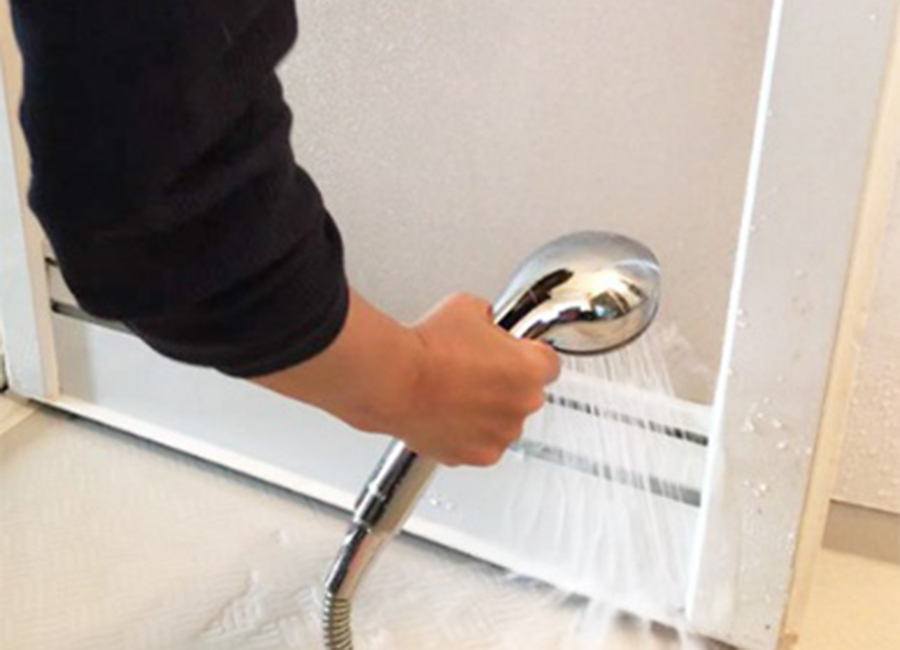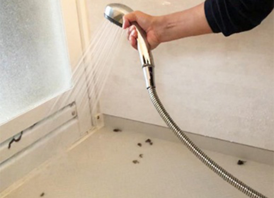 - 浴室のドアを開けて、浴室内にシャワーでホコリを流します。